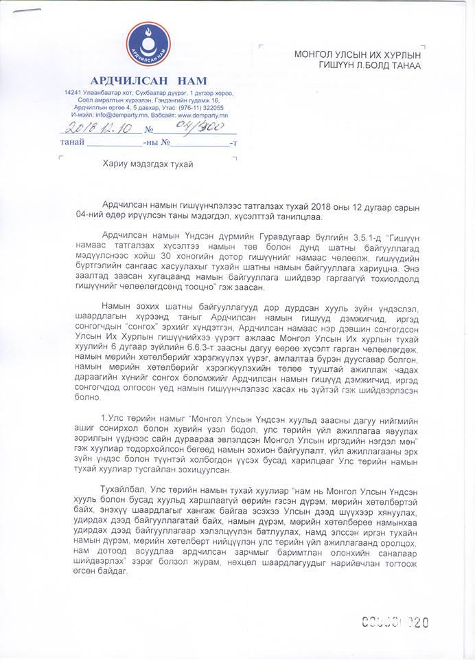“Ардчилсан намын гишүүд дэмжигчид иргэд сонгогчдын сонгох эрхийг хүндэтгэн Ардчилсан намаас нэр дэвшин сонгогдсон Улсын Их Хурлын гишүүнийхээ үүрэгт ажлаас Монгол Улсын Их хурлын тухай хуулийн 6 дугаар зүйлийн 6.6.3-т заасны дагуу өөрөө хүсэлт гарган чөлөөлөгдөж намын мөрийн хөтөлбөрийг хэрэгжүүлэх үүрэг, амлалтаа бүрэн дуусгавар болгон намын мөрийн хөтөлбөрийг хэрэгжүүлэхийн төлөө тууштай ажиллаж чадах дараагийн хүнийг сонгох боломжийг Ардчилсан намын гишүүд дэмжигчид, иргэд сонгогчдод олгосон үед намын гишүүнчлэлээс хасах нь зүйтэй гэж шийдвэрлэсэн болно” гэсэн хариу өгчээ.