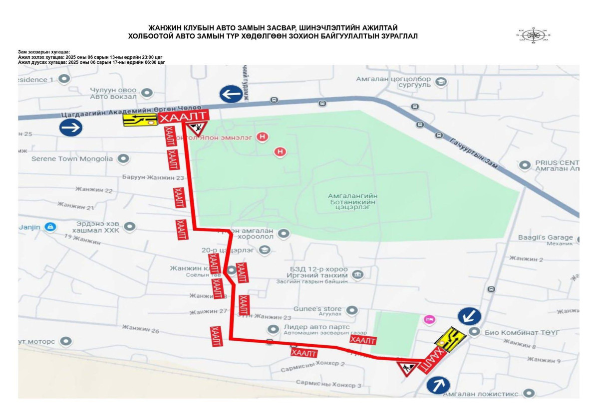 Баянзүрх дүүргийн 12 дугаар хороо, Жанжин клубийн авто замын хэсэгчилсэн засвар, шинэчлэлтийн ажлын хүрээнд Цагдаагийн академийн өргөн чөлөөнөөс урагш Төмөр замын нүхэн гарцын уулзвар хүртэлx 1.6 км урт авто замыг хааж, шинэчилнэ. Тодруулбал, авто замыг өнөөдөр буюу зургаадугаар сарын 13-ны 23:00 цагаас хааж, 17-ны 06:00 цагт нээнэ.