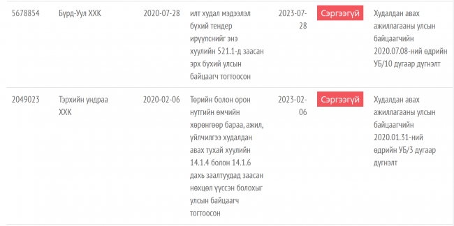 Тодруулбал, Төрийн болон орон нутгийн өмчийн хөрөнгөөр бараа, ажил, үйлчилгээ худалдан авах тухай хуулийн 14 дүгээр зүйлийн 14.5 дахь хэсэг, 52 дугаар зүйлийн 52.1.14 дэх заалт, "Тендерт оролцох эрхээ хязгаарлуулсан этгээдийн бүртгэлийг хөтлөх журам"-ын 2.4-т заасны дагуу Сангийн сайдын 2020 оны 210 дугаар тушаалаар дараах компаниудыг “Тендерт оролцох эрхээ хязгаарлуулсан этгээдийн бүртгэл”-д бүртгэжээ.