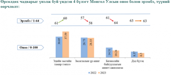Анх 2015 онд судалгаа хийхэд манай улс 57 дугаарт эрэмбэлэгдэж байсан. Монгол Улсын хувьд энэ нь хамгийн өндөр үзүүлэлт байсан. Харамсалтай нь 2023 онд сүүлээсээ гуравдугаарт эрэмбэлэгдсэн байна.