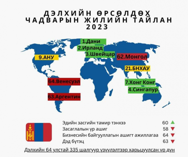 -Дэлхийн өрсөлдөх чадварын жилийн тайланг нийт 335 шалгуур үзүүлэлтээр судлан эрэмбэлж, боловсруулдаг. Тус тайлан улс орныг хөгжүүлэх чиглэлд явуулсан бодлого, үйл ажиллагаа ямар үр дүнд хүрсэн бэ гэдгийг харуулдаг. Улс орнууд тодорхой үзүүлэлтүүдээр нийт 100 оноо авахаас манай улс 35.56 оноотой байна. Энэ нь өмнөх оноос 0.64 оноогоор буурч, нэг эрэмбэ ухарсан үзүүлэлт юм.